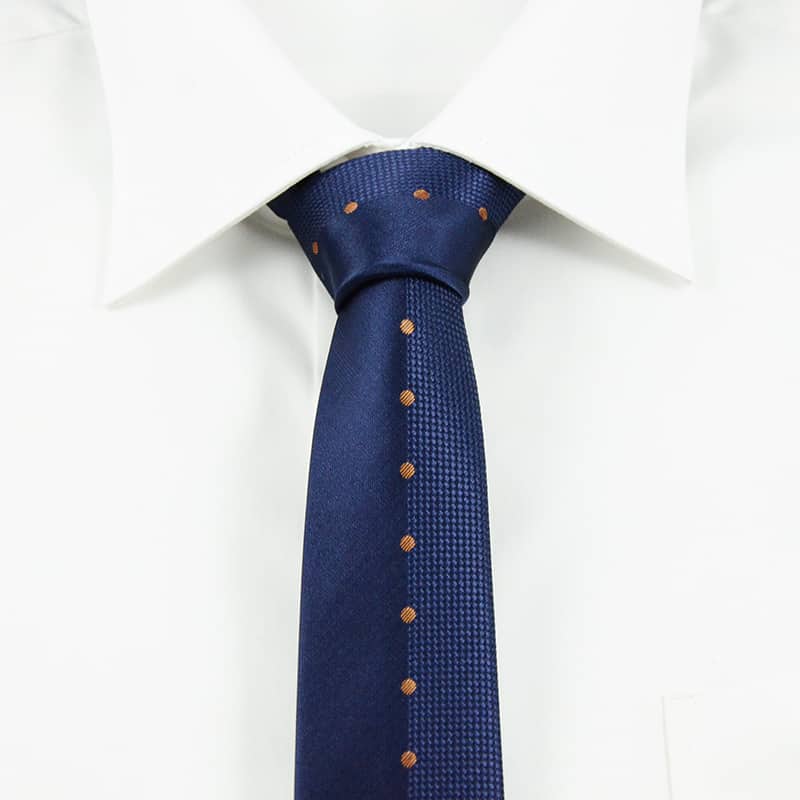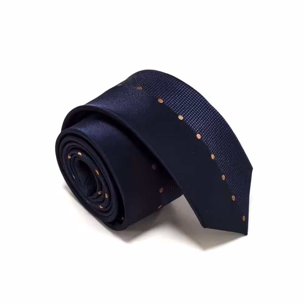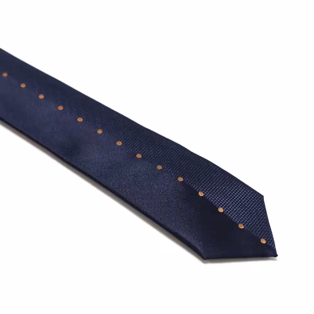 Et super moderne, blåt slips med orange prikker. Dette slips er perfekt til dig der er vild med de klassiske linjer, men samtidig gerne vil have et moderne slips. Slipset kommer i en utrolig flot og klassisk navy farve, som let kan kombineres med et hav af andre styles, farver og nuancer. Slipset har dog et moderne twist. Det kommer nemlig med orange prikker, så du ikke får et kedeligt, ensfarvet slips. De orange prikker komplimenterer den mørke navy-farve og giver slipset et unikt og spændende design. Dette slips er et absolut must-have, hvis du leder efter et alsidigt slips. Det flotte design kan både bruges til hverdag og til fest, så du får et slips der kan matches med alt fra fine jakkesæt til casual skjorter. Hos BalderClothes finder du et bredt udvalg af modetøj og accessories til mænd. Vi forhandler kun produkter i den bedste kvalitet og vores slips er ingen undtagelse. Disse slips fremstilles i de bedste materialer, så du ikke kun får et produkt der ser godt ud. Vi garanterer at slipset og sidder super godt og er behageligt at have på. Derudover er det let at binde, så du kan skabe et skarpt og elegant look. Vi anbefaler at du binder den populære og velkendte “four-in-hand” knude, så slipsets prikker fremstår lige. Du har også mulighed for at style slipset op med en af vores slipsenåle. Udover at holde slipset på plads, så får du et mere elegant og stilrent look.