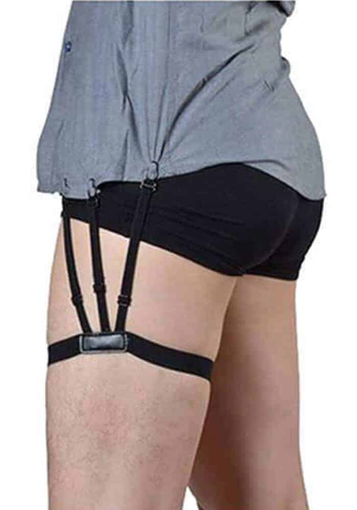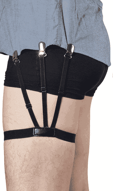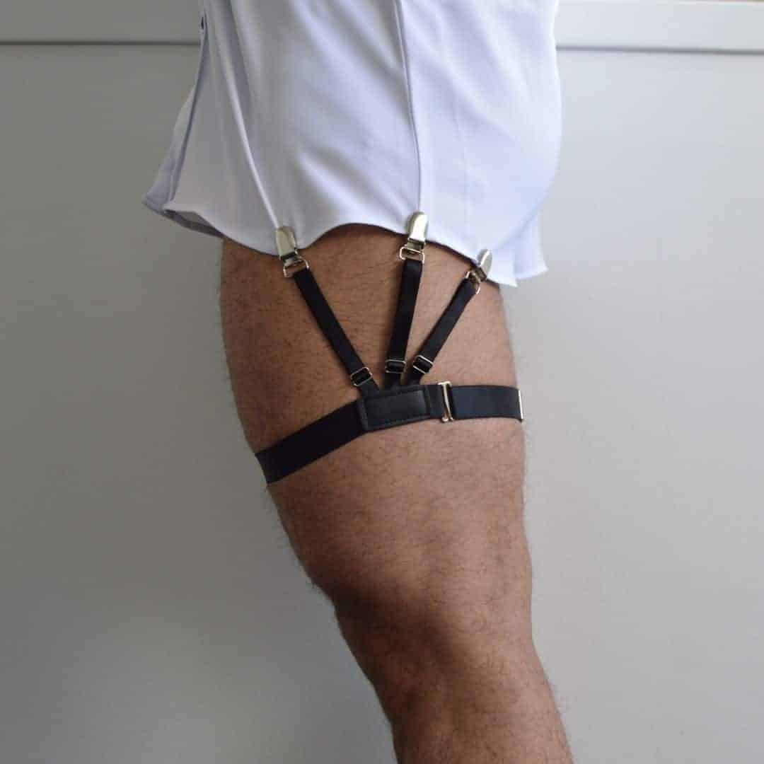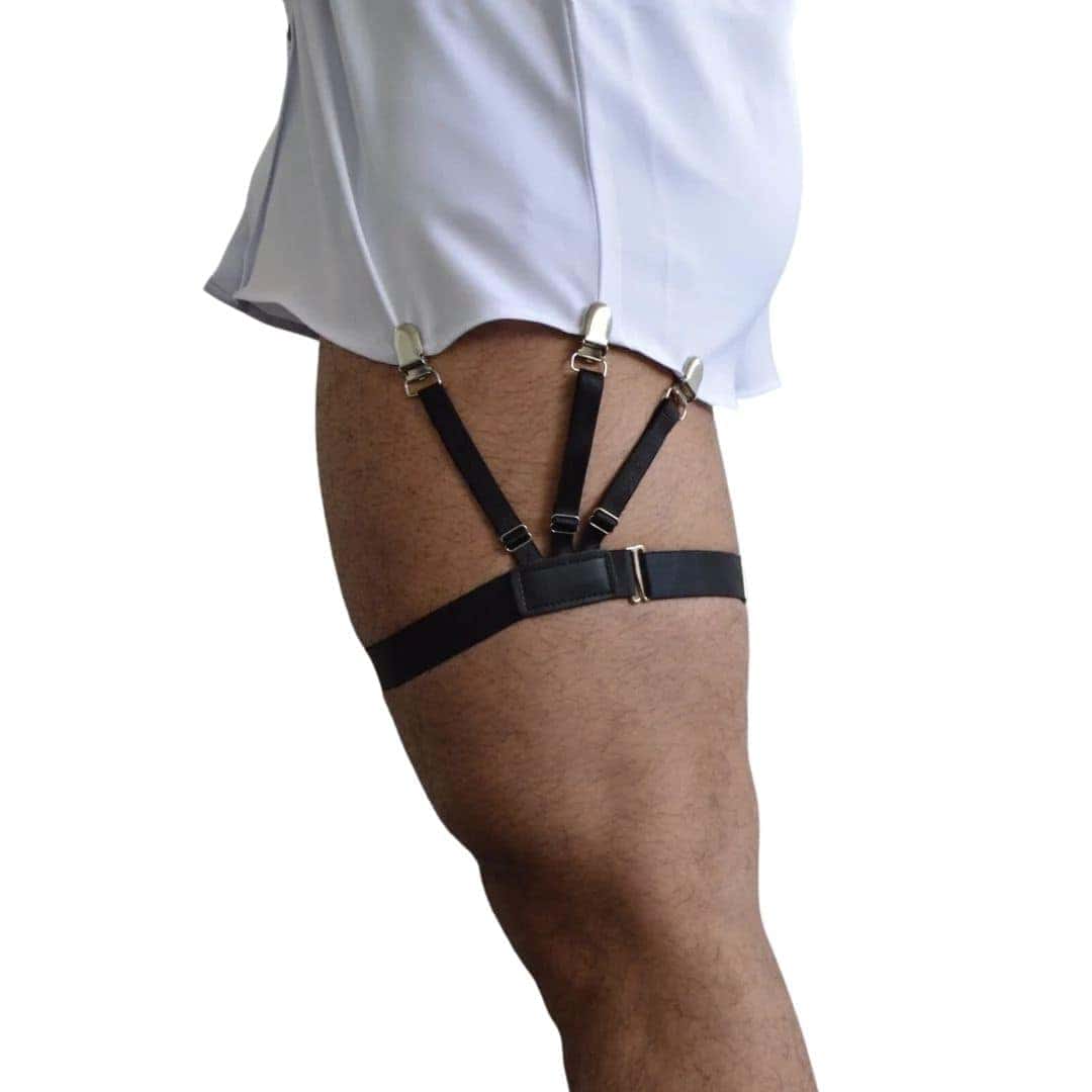 Holderen påføres nemt og enkelt om hvert lår. Med justerbare elastikker kan du stramme anordningerne, så de sidder så behageligt som muligt. Husk, at elastikken skal sidde om den tykkeste del af dine lår. De tre klemmer peger nu opad, så du kan klipse skjorten fast. Husk at sørge for at tjekke spændstigheden, inden du tager bukser på. Skjorten skal sidde ordentligt uden at stramme, både når du står og går, og når du sætter dig igen. Elastikkerne skal ikke sidde så stramt, at du ikke kan have armene over hovedet – her må du kun kunne mærke et lille stræk i skjorten. Elastikkerne klipses fast foran midt på hvert lår, i siden og midt ud fra hvert baglår. Bestil sættet allerede dag, og få den leveret inden for få dage.