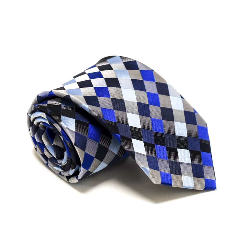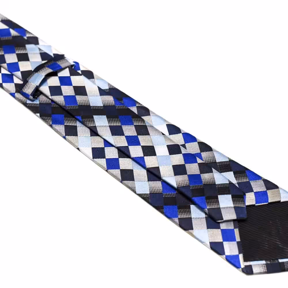 Dette slips med grå og blå farver giver et råt og køligt udtryk til et klassisk jakkesæt i sort med tilhørende hvid skjorte!